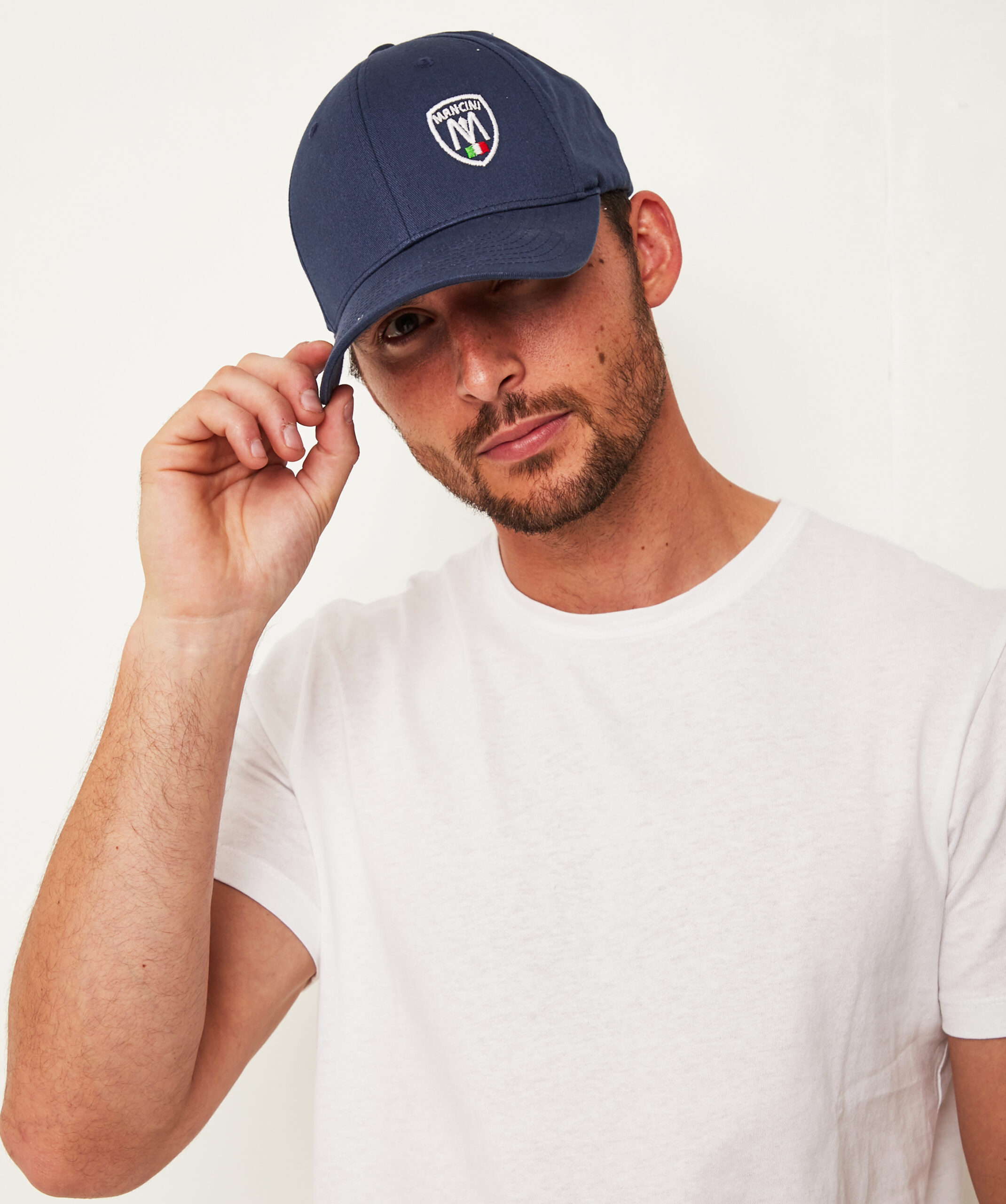 - Mancini shield logo in contrast stitching