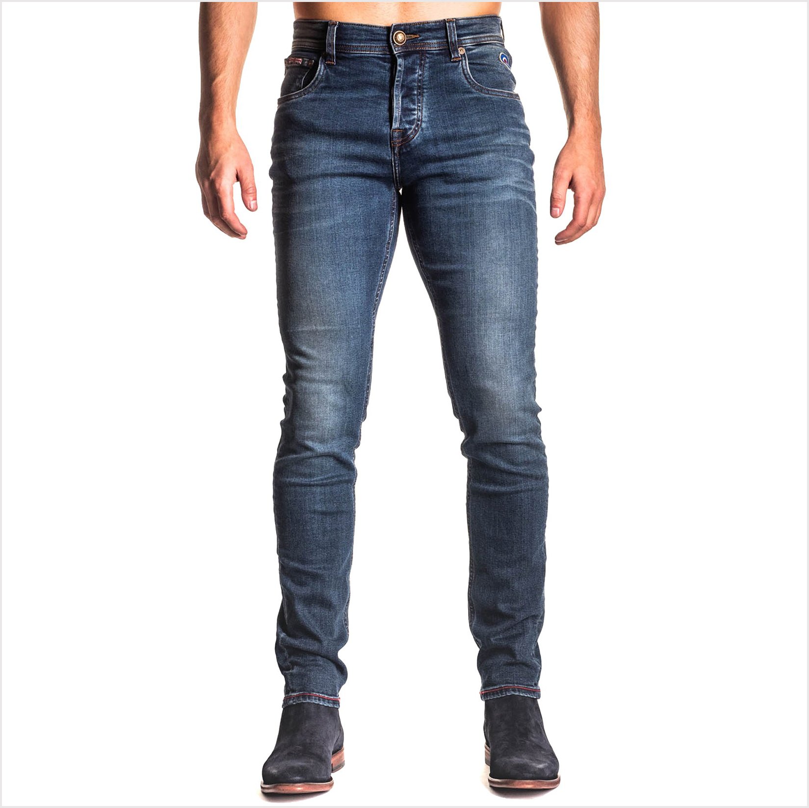 The denim is a luxury stretch blend, finished in a medium blue, with vintage wash detail and red stitching. The Spitfire is offered in a Slim fit.